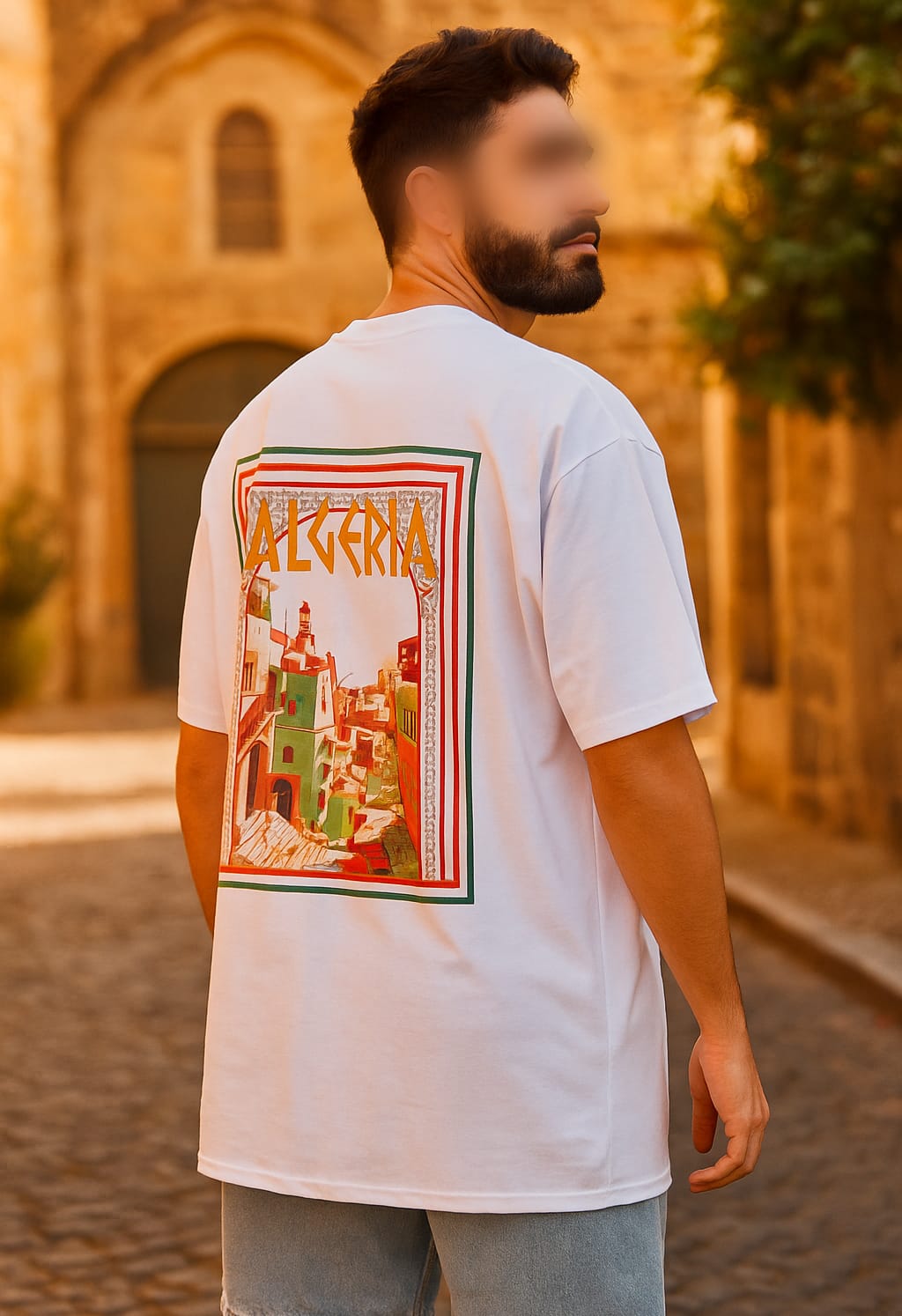 Mettez l’Algérie à l’honneur avec ce t-shirt oversize au visuel artistique vibrant !